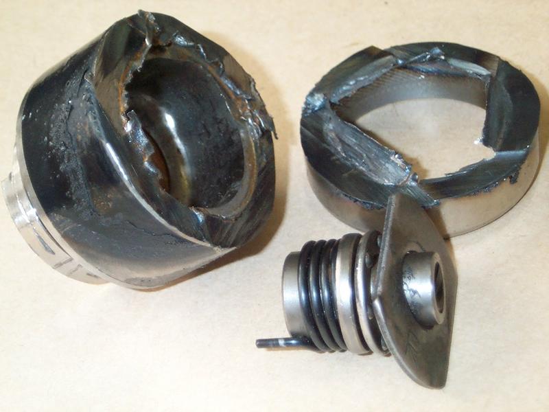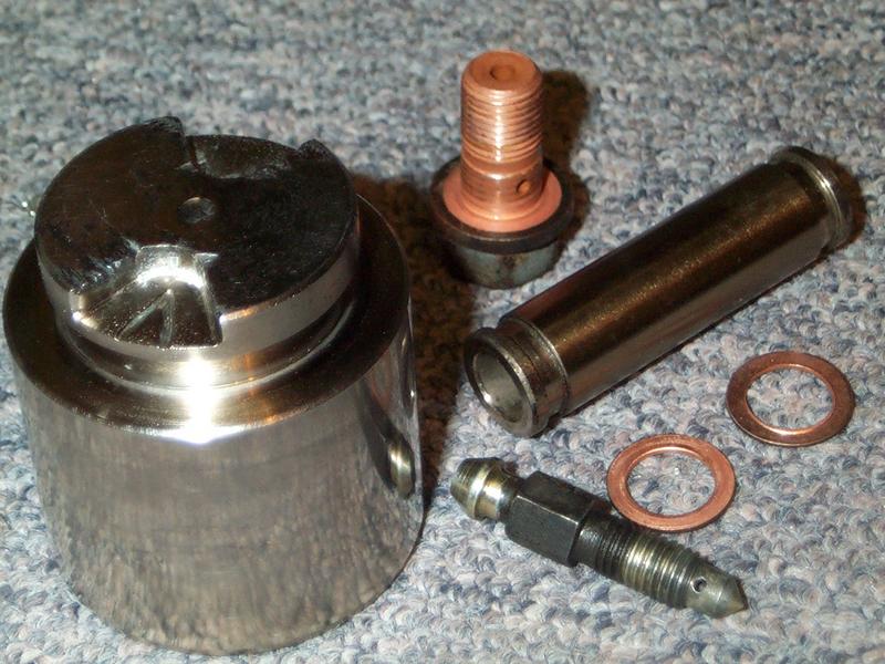 I'm not quite sure how you're supposed to get the internals of the OEM piston out to use for the replacement Budweg piston. Unless you've got a very specialised tool I think you'll need to carefully cut the piston about 10 mm down (I used a large high power abrasive cut-off saw, not sure if a lathe would be a suitable alternative, a hand held angle grinder would work but will take you ages) in order to get access for tools like mole grips, levers or grinders. I accidentally cut it very slightly too fine (allow a good few mm incase it slips in the vice due to vibration) so in the end I just levered the plate out - I'm not sure whether it will actually just twist out.