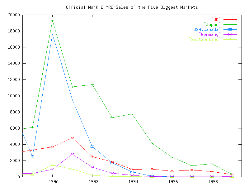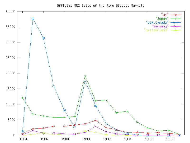 Note these represent official new sales only. In terms of MR2s on the road, the figures for the United Kingdom should be adjusted upwards somewhat. I would guess about a third of the MR2s on the road in the United Kingdom are imports from Japan, and this proportion will rise in future (The Japanese allegedly don't like cars much over 5 years old, so they trickle over to other Right Hand Drive countries especially the U.K. where car prices were high).